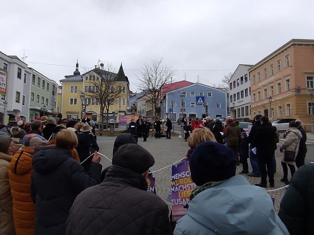 In einer Ökomene-Veranstaltung rufen der neue katholische Stadtpfarrer Martin Dengler und die evangelische Pfarrerin Frau Schuster zum Miteinander auf. In einem von einem Seil umschlossenen Raum trafen sich letzten Samstag, den 15. Februar ca. 100 Menschen auf dem Grafenauer Stadtplatz, um der Spaltung unserer Gesellschaft eine Absage zu erteilen. Das Motto der Veranstaltung war "Menschenwürde, Nächstenliebe, Zusammenhalt " wählen.